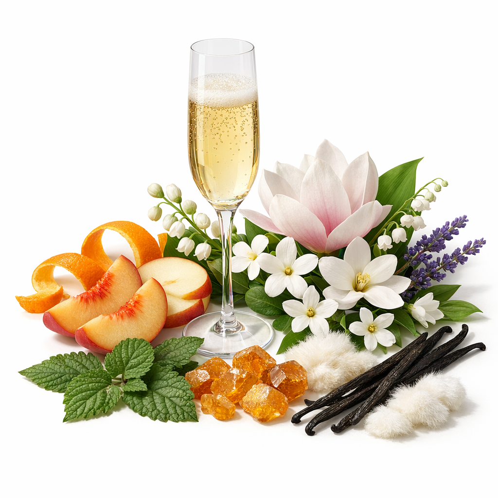 Notes: Sparkling wine, peach, orange peel and apple; middle notes are jasmine, magnolia, lily of the valley and lavender; base notes are patchouli, amber, musk and vanilla bean