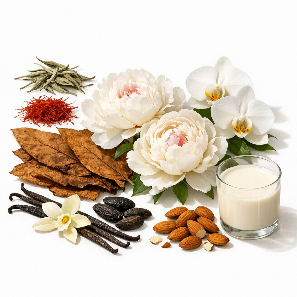 Notes: Top notes are white tea and saffron; middle notes are tobacco, peonies and orchid; base notes are tonka bean, vanilla and almond milk.